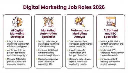 Additionally, AI-focused job roles offer better career progression. Professionals can move into leadership positions such as marketing strategists, growth managers, or analytics leads within a few years. This makes digital marketing job roles 2026 more stable and future-proof compared to traditional marketing roles that lack technical depth.