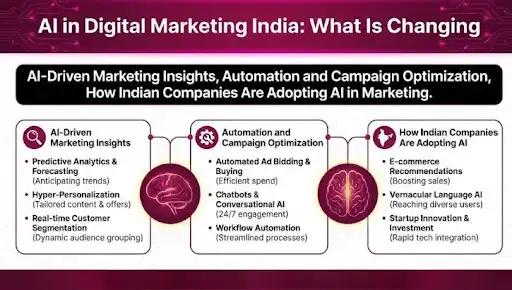 AI adoption in digital marketing is accelerating across Indian businesses, not just large enterprises but also startups and SMEs. Companies are increasingly using AI to reduce manual work, improve targeting accuracy, and make faster marketing decisions. This shift is driven by rising competition, increasing digital ad costs, and the need for measurable ROI.