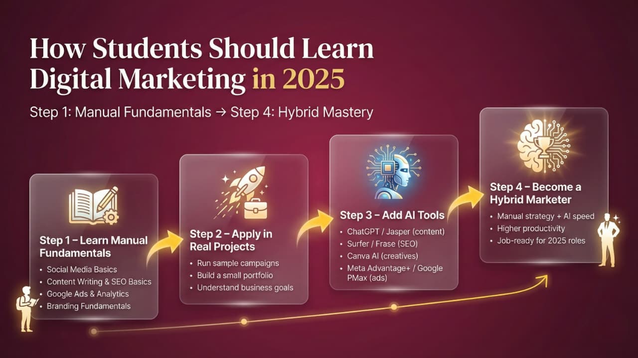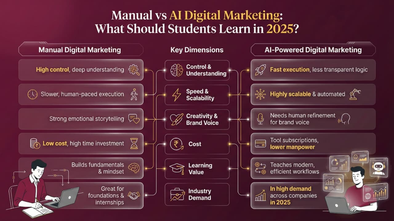 This article breaks down manual vs AI-powered digital marketing, explores the strengths of each, compares their learning value, and helps students choose the right path for long-term career success.