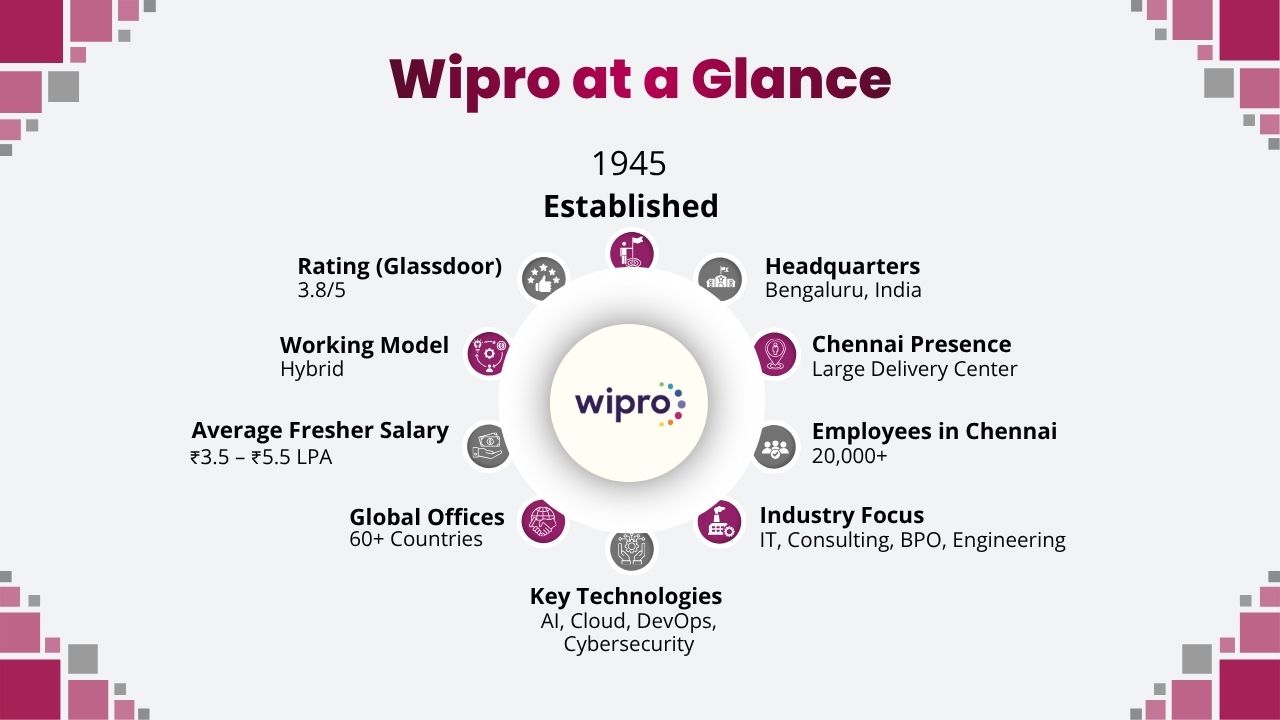 Wipro is one of India’s oldest and most respected IT companies, known for its strong global presence, advanced digital transformation capabilities, and large-scale engineering and consulting services. Chennai serves as a major delivery hub for Wipro, hosting thousands of employees across cloud, AI, cybersecurity, testing, full-stack development, and infrastructure operations. The company is well-known for its work culture, stability, training programs, and opportunities for both freshers and experienced professionals.