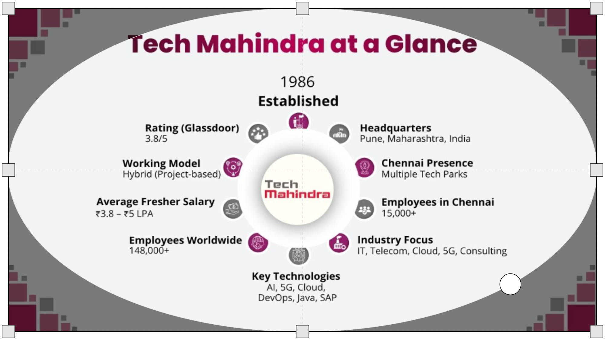 Tech Mahindra is one of India’s leading IT and digital transformation companies, known for its strong presence in telecom, BFSI, manufacturing, and enterprise technology. With multiple offices in Chennai, it plays a major role in delivering next-gen solutions across AI, cloud, cybersecurity, 5G, data engineering, and automation.