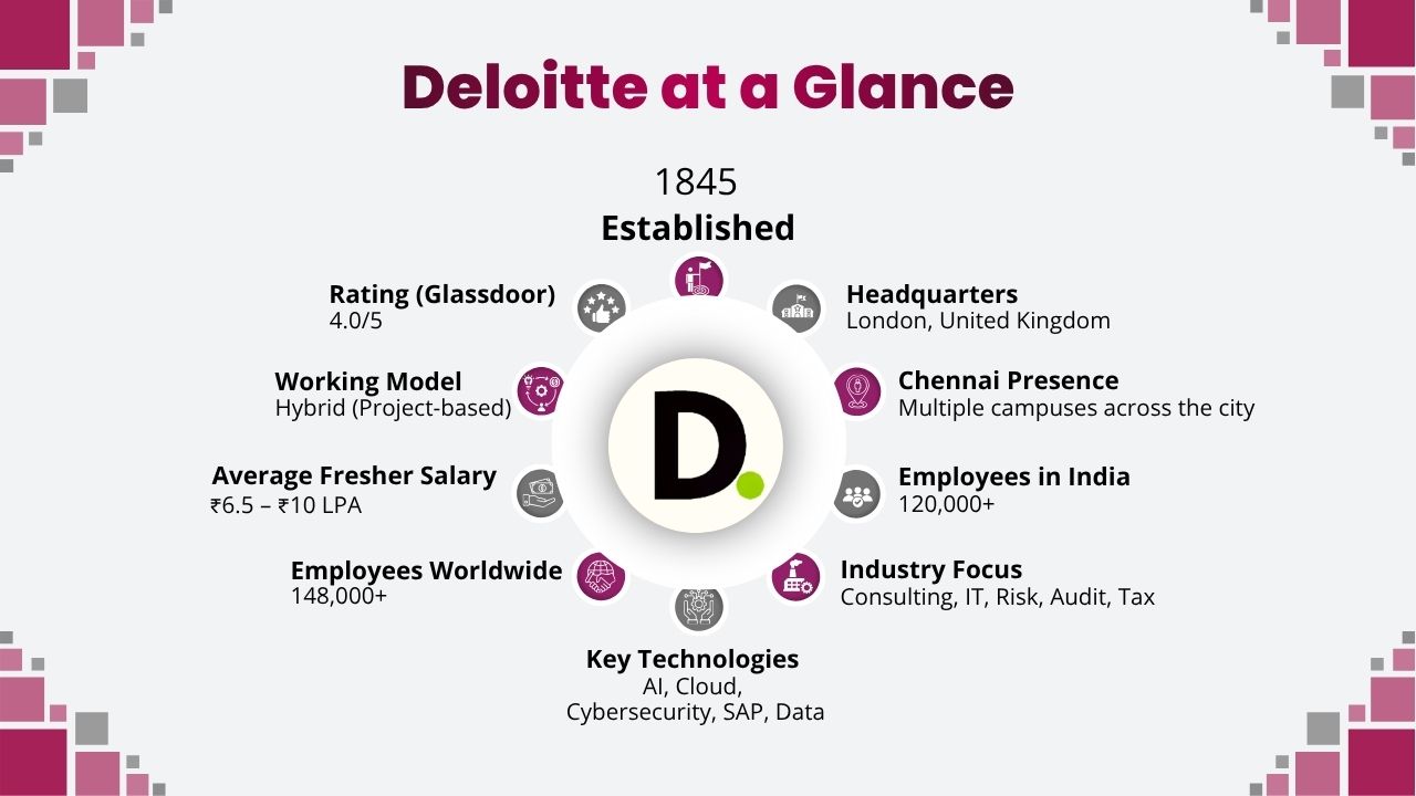 Deloitte is one of the world’s “Big Four” consulting and professional services firms and a top employer for technology, consulting, and analytics roles in Chennai. Known for its exceptional work culture, global client base, and emphasis on innovation, Deloitte offers a strong career pathway for both freshers and experienced professionals.