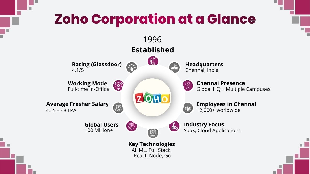 Zoho Corporation is one of India’s most admired and influential SaaS product companies. Headquartered in Chennai, Zoho has built a global reputation for its 55+ cloud-based business apps used by over 100 million users worldwide. Known for its engineering-first culture, deep R&D mindset, zero outside funding, and unique approach to developing talent, Zoho is considered one of the best workplaces for freshers who want to learn full-stack development, product engineering, UI/UX, AI-driven application building, and customer-focused software development.