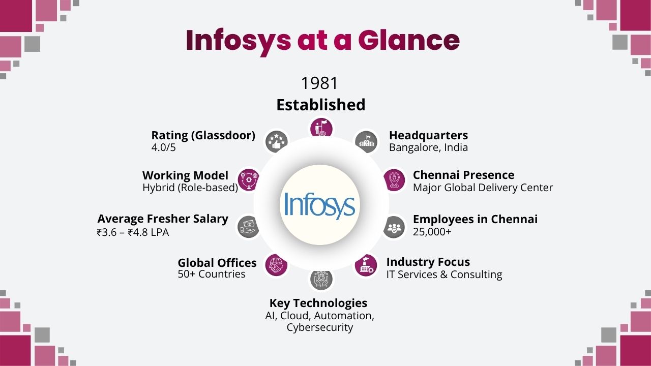 Infosys is one of India’s most prestigious IT and consulting companies, known globally for its innovation in digital transformation, next-gen IT services, and enterprise modernization. Chennai is home to one of Infosys’ largest and most advanced development centers, offering state-of-the-art infrastructure, global client exposure, best-in-class training (Infosys Lex), and strong opportunities for freshers and experienced professionals alike. With a strong focus on AI, cloud, cybersecurity, and automation, Infosys continues to be a top choice for IT talent in Chennai.