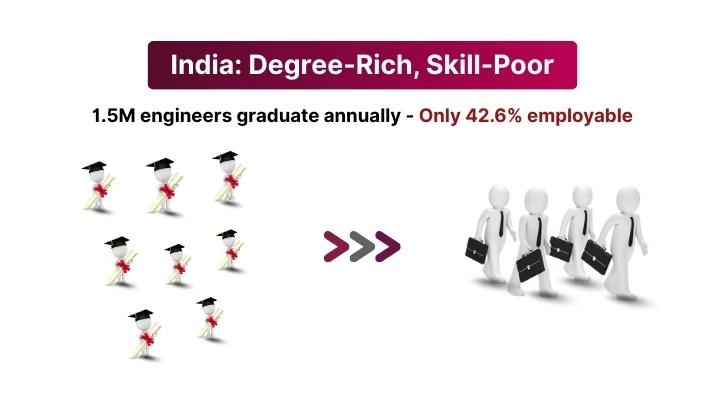 Every year, India awards 1.5 million engineering degrees and millions more across arts, commerce, science, and professional disciplines. Yet, a sobering truth shadows this achievement: only 42.6% of Indian graduates are actually employable, according to the Mercer-Mettl Graduate Skill Index 2025, a decline from 44.3% in 2023.