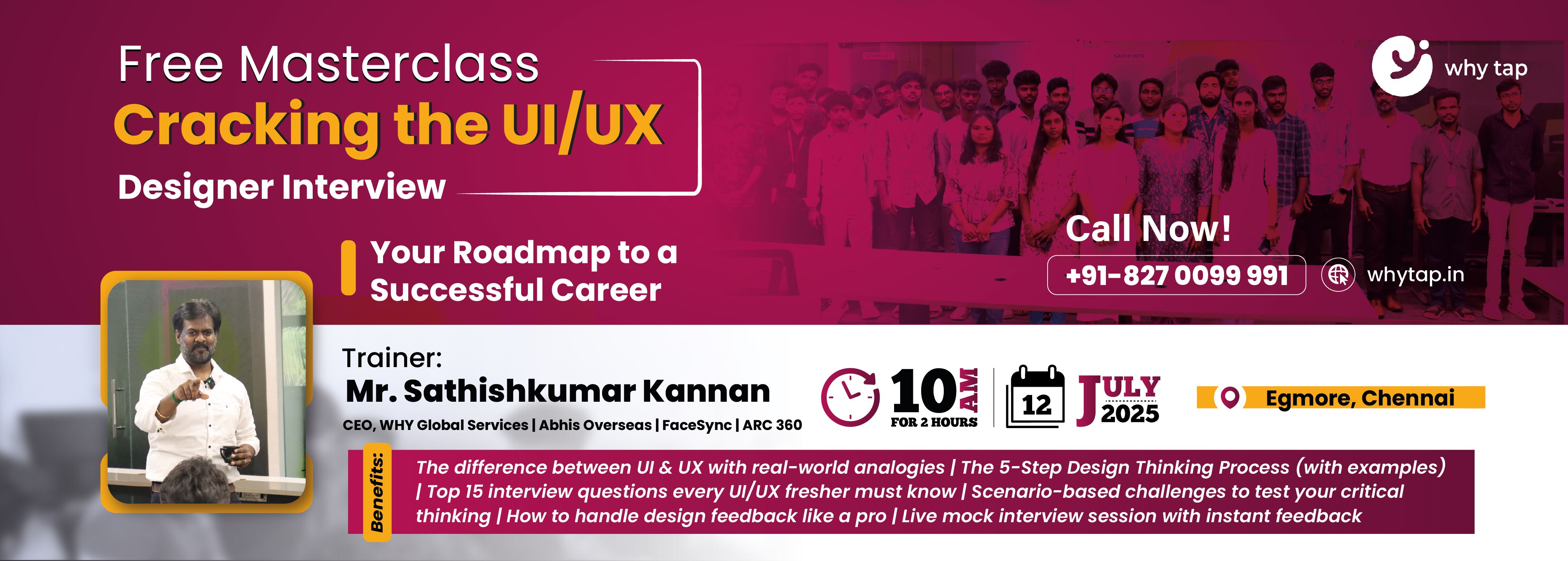 On 12th July 2025, the WHY TAP campus in Chennai turned into a vibrant learning hub for aspiring UI/UX designers. The much-awaited masterclass on cracking the UI/UX designer interview brought together energy, curiosity, and hands-on learning in a focused two-hour session—both offline and online.